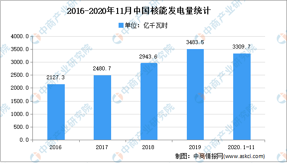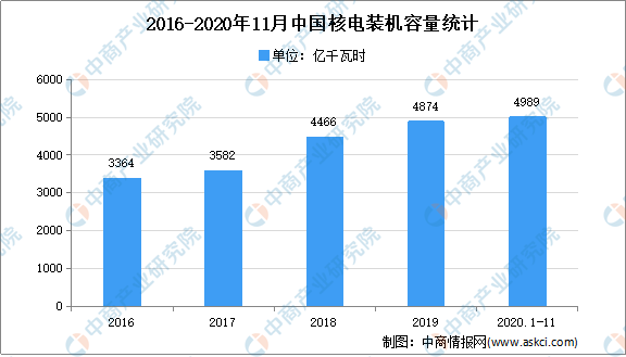 我國是世界上少數擁有比較完整核工業(yè)體系的國家之一,一直有序、積極的推進核電的應用。從核電裝機容量來看,近年來保持向好的趨勢,2018年核電裝機量突破4000萬千瓦。數據顯示,2020年1-11月,我國核電裝機容量為4989萬千瓦,同比增長2.4%;全國核電發(fā)電量3310億千瓦時,同比增長5%。