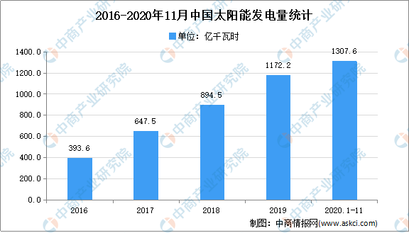 太陽能是一種可再生能源,指太陽的熱輻射能,主要表現就是常說的太陽光線,一般用作發(fā)電或者為熱水器提供能源。太陽能的利用有光熱轉換和光電轉換兩種方式,目前,太陽能光伏發(fā)電系統(tǒng)是主要的應用。近年來,我國太陽能發(fā)電量持續(xù)提高。數據顯示,2019年我國太陽能發(fā)電量為1172.2億千瓦時。2020年1-11月我國太陽能發(fā)電量累計達1307.6億千瓦時,同比增長8.1%。