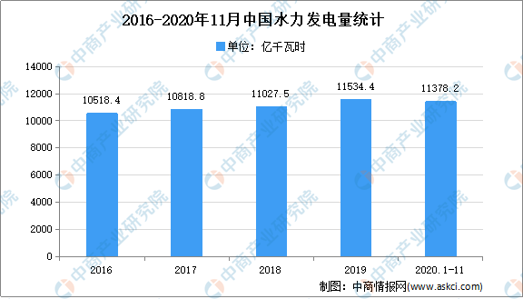 水能是一種清潔能源,指水體的動能、勢能和壓力能等能量資源。水能是一種可再生能源,主要用于水力發(fā)電。我國具有豐富的水力資源,水力發(fā)電是主要電力來源之一。數據顯示,2019年我國水力發(fā)電量為11534.4億千瓦時。2020年1-11月我國水力發(fā)電量累計達11378.2億千瓦時,同比增長4.9%。