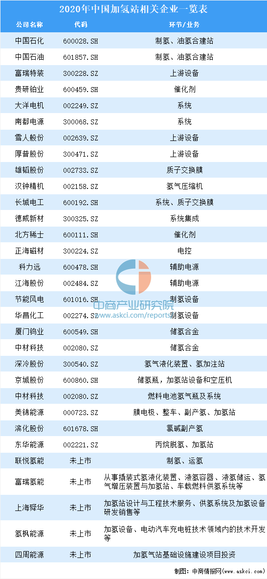 加氫站是給燃料電池汽車提供氫氣的燃氣站,作為給燃料電池汽車提供氫氣的基礎設施,加氫站的數量也在不斷增長,數據顯示,截止2019年底,全國累計已建成的加氫站共有61座(其中3座已拆除),已經投入運營的有52座,在建/擬建加氫站數量為72座。其中,在已經投入運營的有52座加氫站中,有25座是在2019年新增投入運營的。