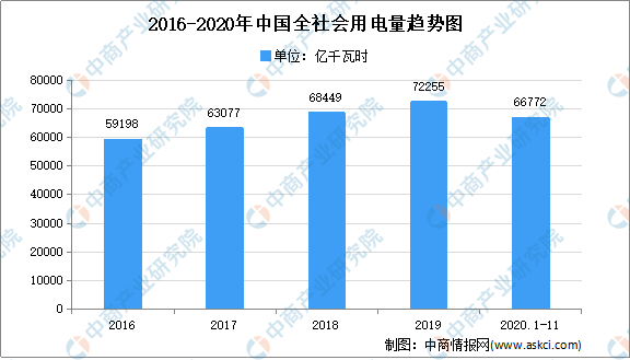 2020年,第一產業(yè)和城鄉(xiāng)居民生活用電保持較快增長,數據顯示,2020年1-11月,全國全社會用電量66772億千瓦時,同比增長2.5%,其中,11月份全國全社會用電量6467億千瓦時,同比增長9.4%。