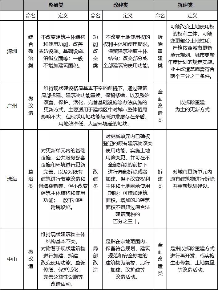 按照改造力度由弱到強(qiáng),城市更新項(xiàng)目可分為整治類、改建類和拆建類三種類型。不同城市命名略有不同,但實(shí)質(zhì)相近,例如深圳將城市更新項(xiàng)目分為綜合整治類、功能改變類和拆除重建類(分別對(duì)應(yīng)整治、改建和拆建);廣州分為全面改造(對(duì)應(yīng)拆建)和微改造(對(duì)應(yīng)整治和改建);中山分為微改造、局部改造和全面改造(分別對(duì)應(yīng)整治、改建和拆建)。
