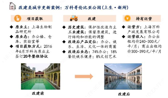 改建類項(xiàng)目改造力度居中、一般需由市級(jí)城市更新管理部門審批,房企一般可通過(guò)改造、持有運(yùn)營(yíng)的等方式參與項(xiàng)目。改建類項(xiàng)目一般不改變土地使用權(quán)的權(quán)力主體和使用期限,在不全部拆除的前提下進(jìn)行局部拆除或加建,可實(shí)施土地用途變更,部分城市可增加建筑面積(但一般會(huì)對(duì)建筑面積增幅設(shè)限,例如珠海要求不超過(guò)30%)。房企可通過(guò)改造、持有運(yùn)營(yíng)等方式參與項(xiàng)目,代表案例如萬(wàn)科上海哥倫比亞公園。