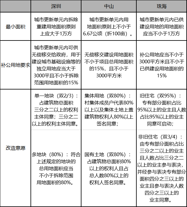 指項(xiàng)目申請(qǐng)納入“城市更新單元計(jì)劃”。申報(bào)主體可以為權(quán)利主體(如村委會(huì)等)、由權(quán)利主體委托的市場(chǎng)主體(如房企)、或市/區(qū)政府,項(xiàng)目申報(bào)需滿足一定前提,如達(dá)到最小改造規(guī)模、補(bǔ)公用地達(dá)到一定比重、改造意愿滿足條件等。其中,改造意愿征集是立項(xiàng)前的關(guān)鍵步驟,不同城市要求有所不同,如深圳為單地塊“雙2/3”,珠海為舊住宅“雙95%”,非舊住宅“雙3/4”。在完成意愿征集后,申報(bào)主體可向區(qū)更新辦提交申報(bào)材料,經(jīng)區(qū)、市兩級(jí)審批后項(xiàng)目納入“城市更新單元計(jì)劃”,標(biāo)志立項(xiàng)成功。
