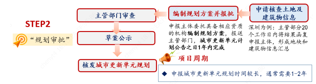 指“城市更新單元規(guī)劃”的編制和審批,通常需在立項(xiàng)公告后一定時(shí)限內(nèi)完成方案報(bào)送,如深圳要求1年。在這一流程中,申報(bào)主體一般首先向主管部門申請(qǐng)核查土地及建筑物信息,再聘請(qǐng)有資質(zhì)的規(guī)劃設(shè)計(jì)單位編制規(guī)劃方案,并與規(guī)劃國(guó)土部門深入溝通、報(bào)審,以獲得對(duì)公司有利的批復(fù)指標(biāo)。專項(xiàng)規(guī)劃報(bào)批是房企就容積率、配建要求等與政府進(jìn)行博弈的過(guò)程,通常需要耗時(shí)1-2年。