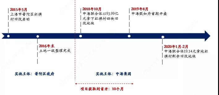 2018年10月,上海海升環(huán)盛房地產(chǎn)開(kāi)發(fā)有限公司(以下簡(jiǎn)稱聯(lián)合體)以93.99億元地價(jià)摘得紅旗村四塊地,該公司由中海地產(chǎn)、上海中環(huán)投資開(kāi)發(fā)(集團(tuán))有限公司、上海新長(zhǎng)征(集團(tuán))有限公司聯(lián)合成立(實(shí)控人為普陀區(qū)長(zhǎng)征鎮(zhèn)農(nóng)村集體資產(chǎn)管理委員會(huì)),持股比例分別為70%、20%、10%;2020年1月-2月,聯(lián)合體再以19.14億元拿下紅旗村剩余舊改地塊。出讓地塊要求競(jìng)得人配建租賃房、保障房、廣場(chǎng)、公共設(shè)施、社區(qū)配套設(shè)施等,同時(shí)商辦項(xiàng)目要求全部自持,且需引入企業(yè)總部、研發(fā)中心、科技創(chuàng)新、現(xiàn)代商貿(mào)等符合普陀區(qū)產(chǎn)業(yè)定位的企業(yè)。2019年8月,中海甄如府首期開(kāi)盤(pán),項(xiàng)目從拿地到首開(kāi)僅10個(gè)月。