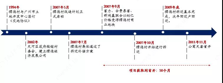 2007年9月,富力、合景泰富、新鴻基聯(lián)合以46億的價(jià)格競(jìng)得獵德村西片區(qū)商業(yè)地塊,其中約25億用作拆遷款安置及新樓建設(shè)款,10億用于投資村南酒店。2007年10月獵德村開(kāi)始進(jìn)行拆遷,2009年底拆遷基本完成,2010年初回遷戶回遷至原村東片區(qū)。