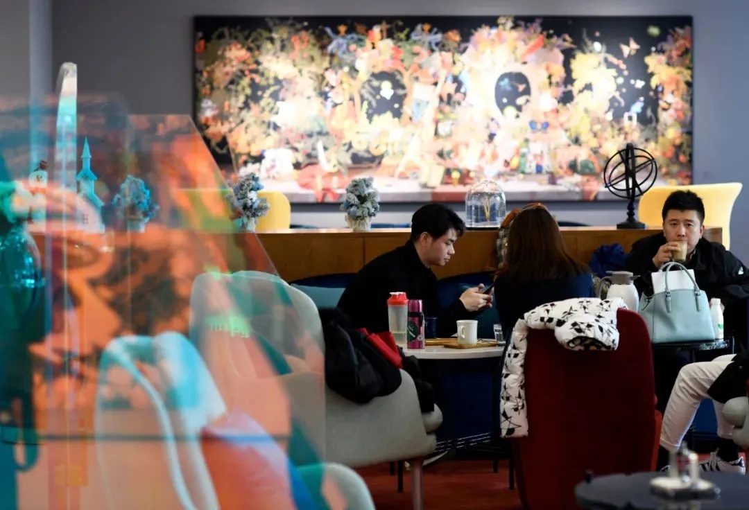 ▲北京市民在通州運河商務區(qū)的一家咖啡館內交談。新華社記者 金良快 攝