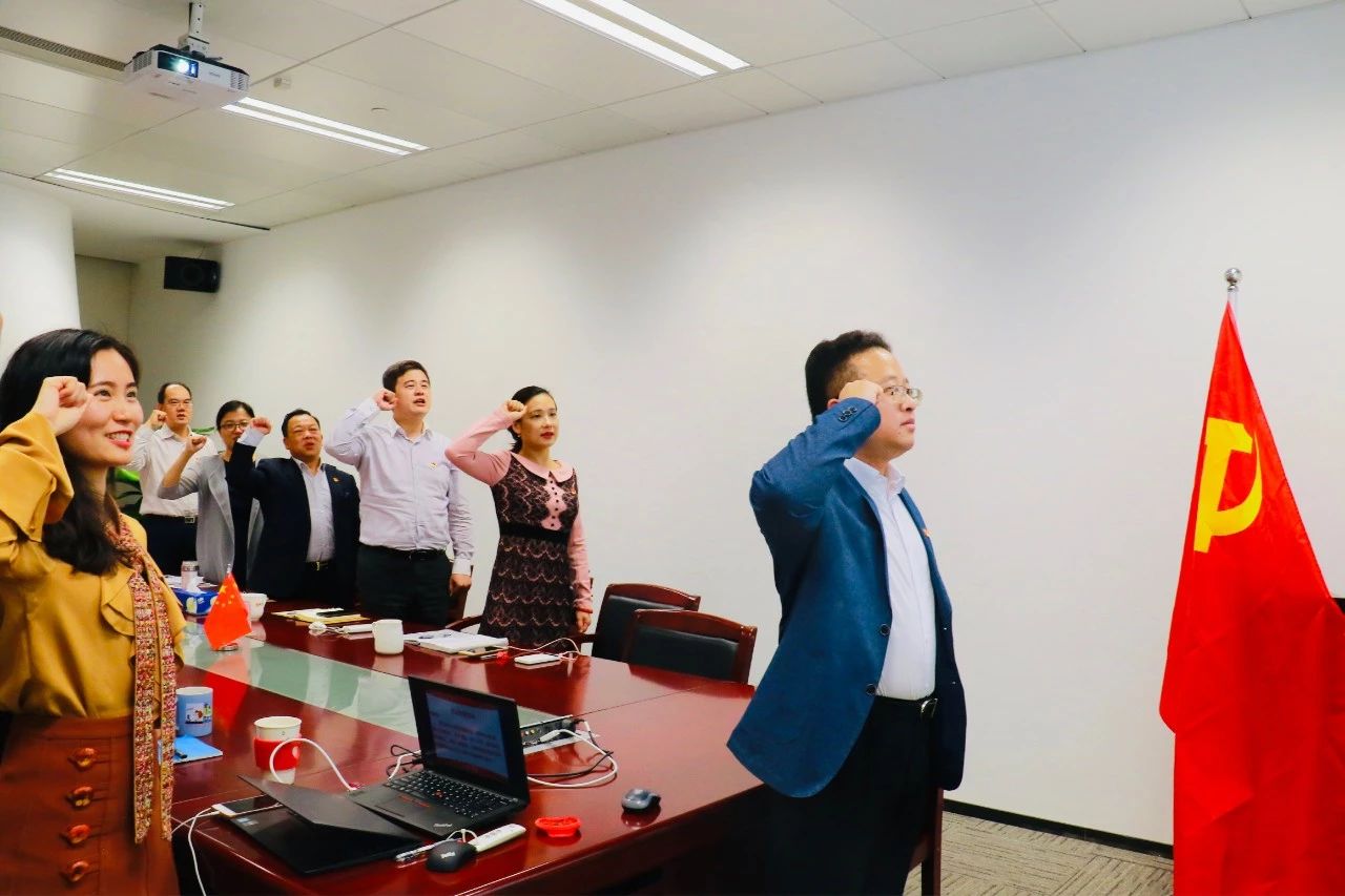 宣誓儀式上,南粵基金董事長林濤右手舉拳,面向黨旗,領誦誓詞,其他高管列隊站立,跟誦誓詞。大家莊嚴宣誓:“忠于中華人民共和國憲法,維護憲法權(quán)威,履行法定職責,忠于祖國、忠于人民,恪盡職守、廉潔奉公,接受人民監(jiān)督,為建設富強、民主、文明、和諧、美麗的社會主義現(xiàn)代化強國努力奮斗!”