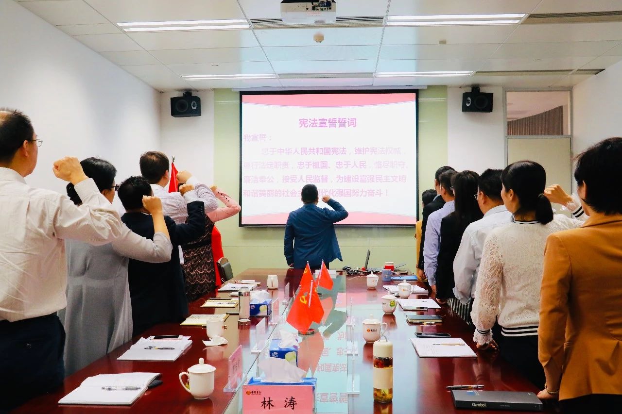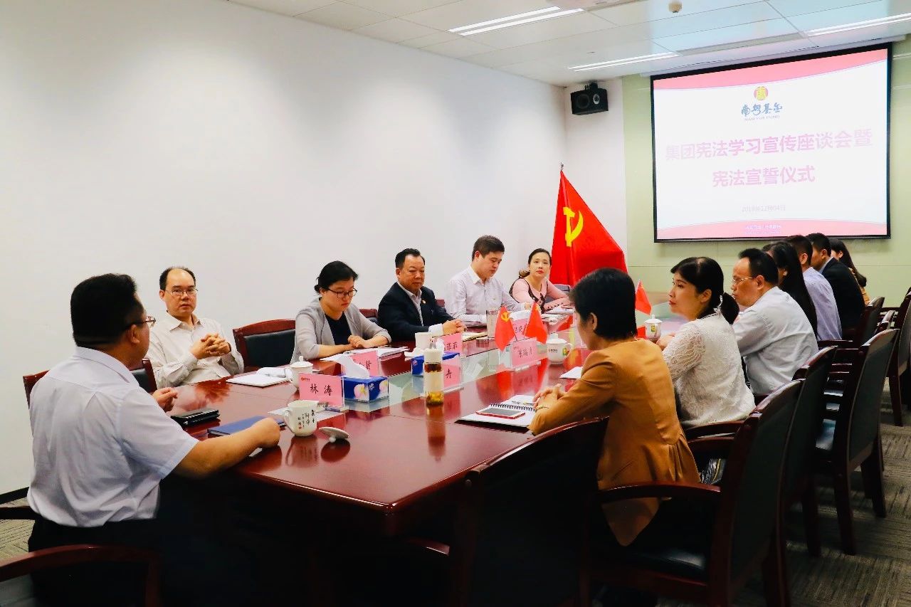 2018年12月4日是我國第五個國家憲法日,也迎來了第一個“憲法宣傳周”。為貫徹落實黨的十九大精神,引導黨員干部忠于憲法和法律,推動法治中國建設,廣州南粵基金集團有限公司(簡稱“南粵基金”)組織全體高管開展憲法學習宣傳座談會,并舉行了莊嚴肅穆的憲法宣誓儀式。