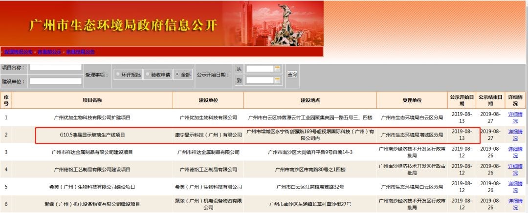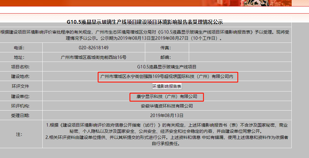 8月13日,廣州市生態(tài)環(huán)境局正式受理并公示康寧集團(tuán)關(guān)于G10.5液晶顯示玻璃生產(chǎn)線項目的官方環(huán)評申請,這意味著廣州獨有的第10.5代TFT-LCD顯示器件項目正有序推進(jìn),將與超視堺第10.5代全生態(tài)產(chǎn)業(yè)園(簡稱“超視堺8K”)項目同步建設(shè)、同期投產(chǎn)。