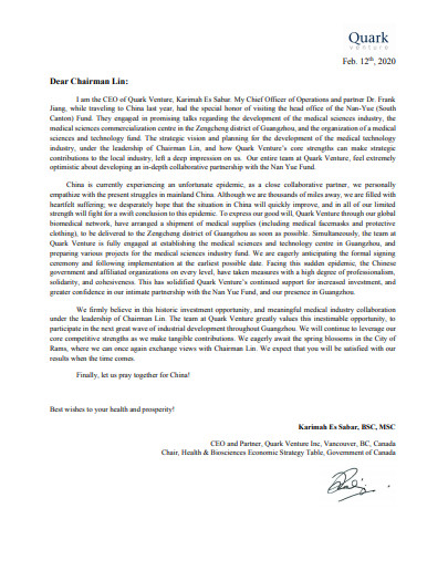 加拿大聯(lián)邦政府經(jīng)濟(jì)戰(zhàn)略委員會(huì)主席、夸克資本(Quark Venture)首席執(zhí)行官卡瑞瑪沙巴來信致敬