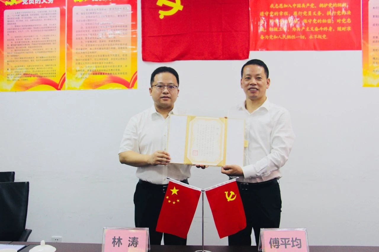 滕頭村黨委書記、滕頭集團(tuán)董事長傅平均(右)為林濤董事長頒發(fā)聘書