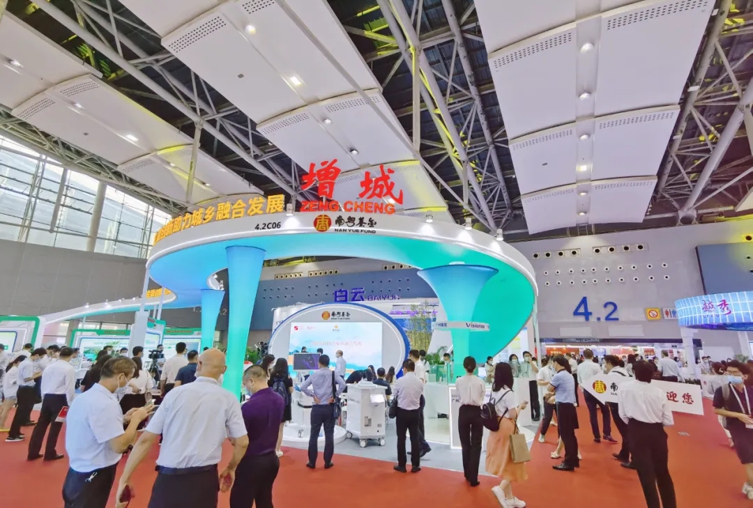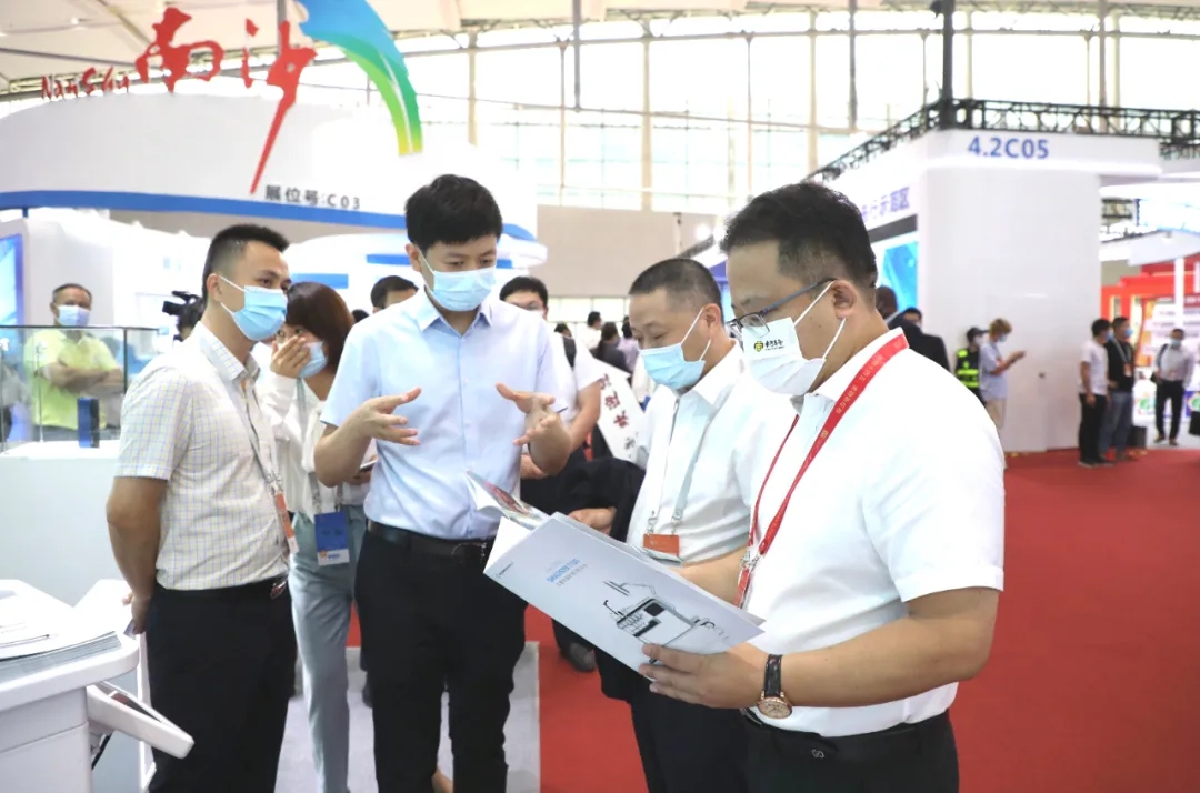 增城區(qū)發(fā)展和改革局局長(zhǎng)曾鴻斌(右二)、南粵基金董事長(zhǎng)林濤(右一)現(xiàn)場(chǎng)聽取奇點(diǎn)醫(yī)療有關(guān)情況介紹
