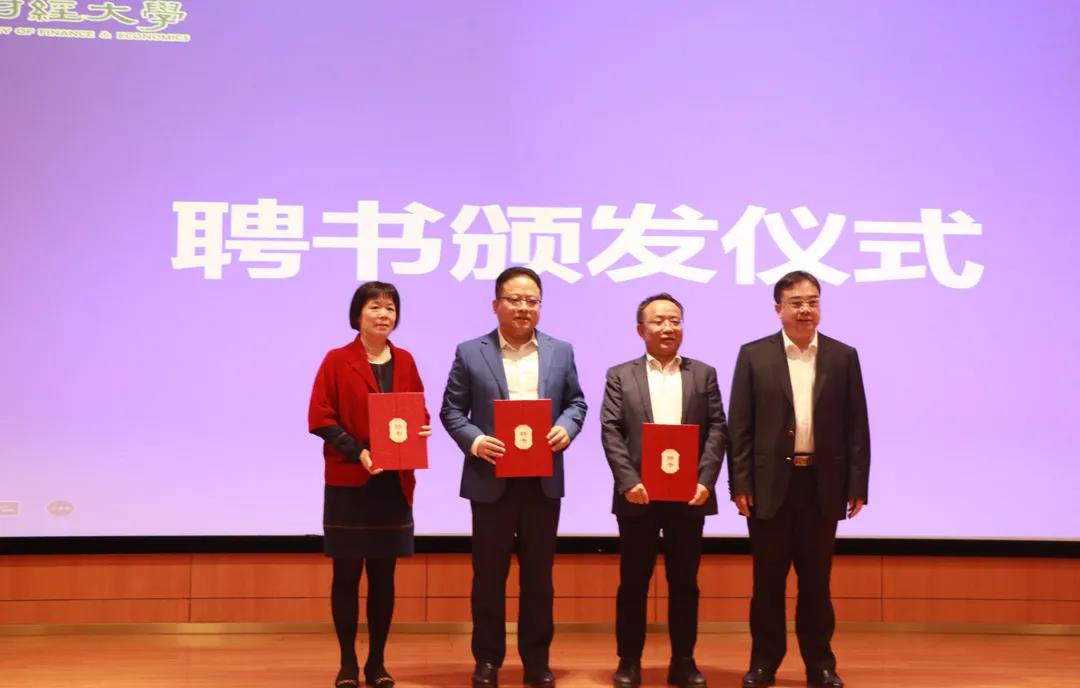 鄭賢操書記(右一)為主任委員于海峰校長(右二)、副主任委員林濤董事長(左二)頒發(fā)聘書