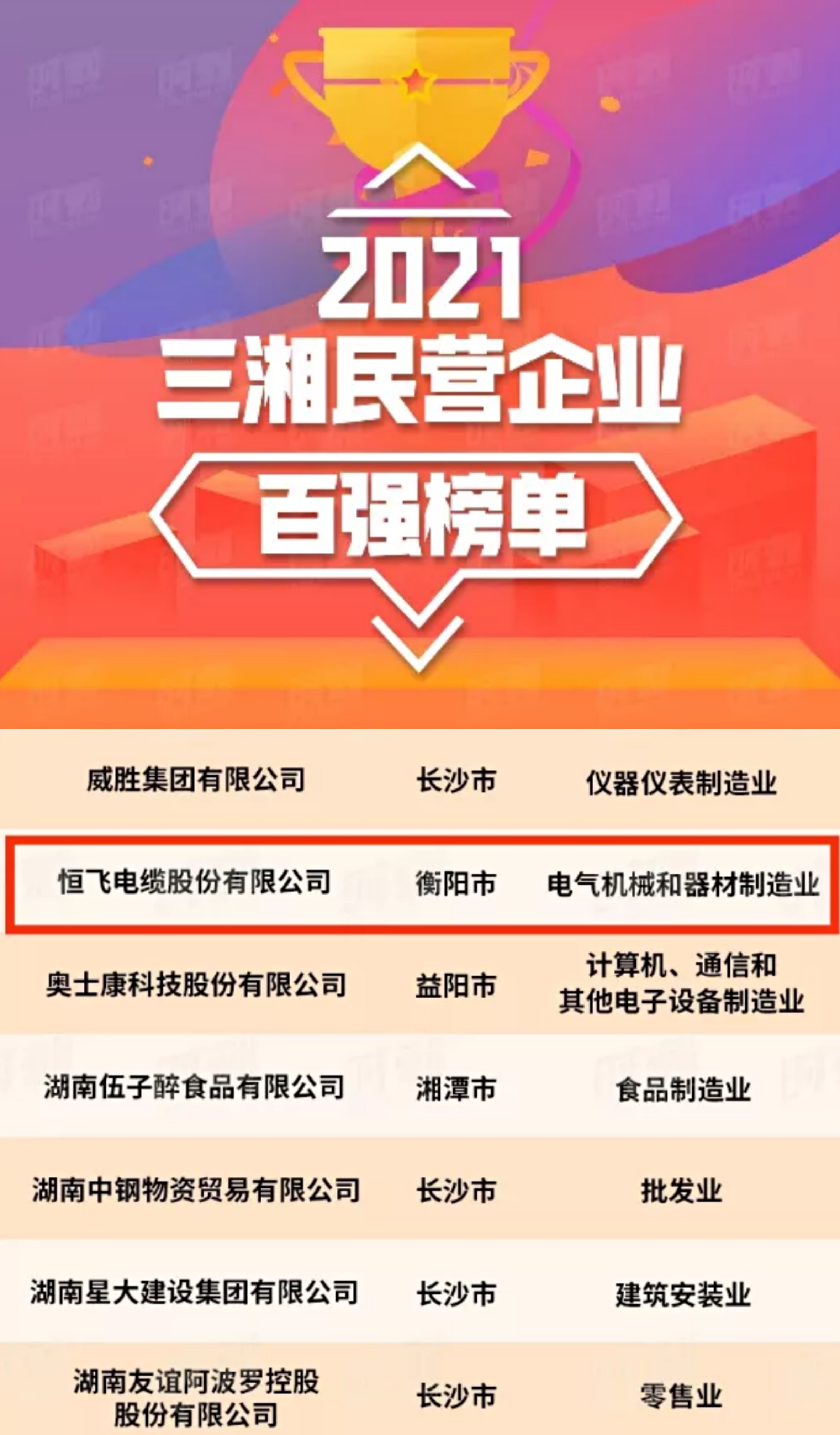 新年伊始,萬象更新。湖南省政府近日發(fā)布了《中共湖南省委湖南省人民政府關(guān)于表彰第一屆新湖南貢獻(xiàn)獎(jiǎng)先進(jìn)集體和先進(jìn)個(gè)人的決定》和2021“三湘民營企業(yè)百強(qiáng)榜”名單,其中,南粵基金投資企業(yè)恒飛電纜股份有限公司(簡稱“恒飛電纜”)榮獲第一屆“新湖南貢獻(xiàn)獎(jiǎng)先進(jìn)集體”,并榮登“2021三湘民營企業(yè)百強(qiáng)榜單”。