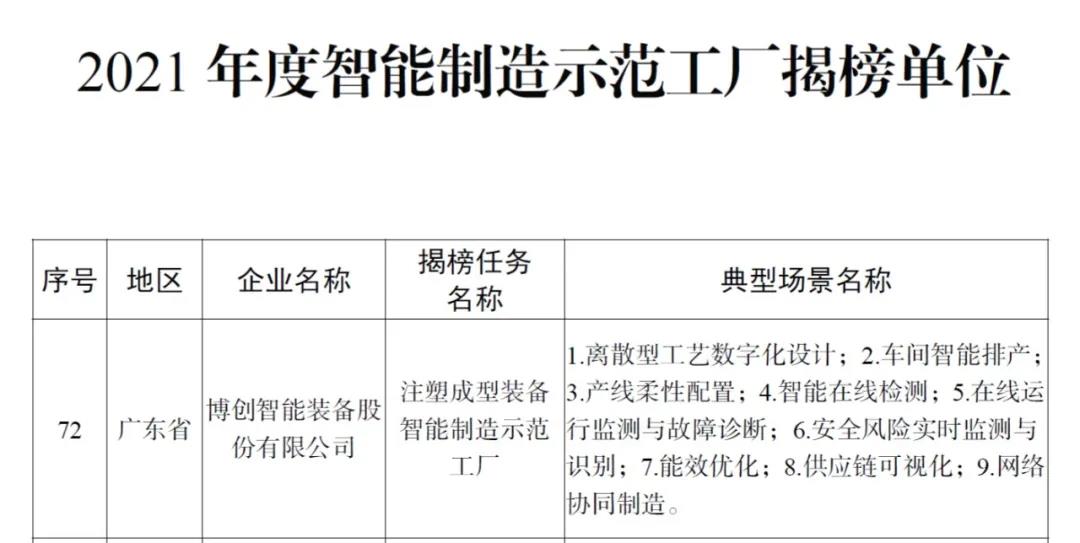近日,國(guó)家工業(yè)和信息化部公布了2021年度智能制造試點(diǎn)示范工廠(chǎng)揭榜單位和優(yōu)秀場(chǎng)景名單,南粵基金投資企業(yè)——博創(chuàng)智能裝備股份有限公司(簡(jiǎn)稱(chēng)“博創(chuàng)智能”)入選智能制造試點(diǎn)示范工廠(chǎng)揭榜單位。