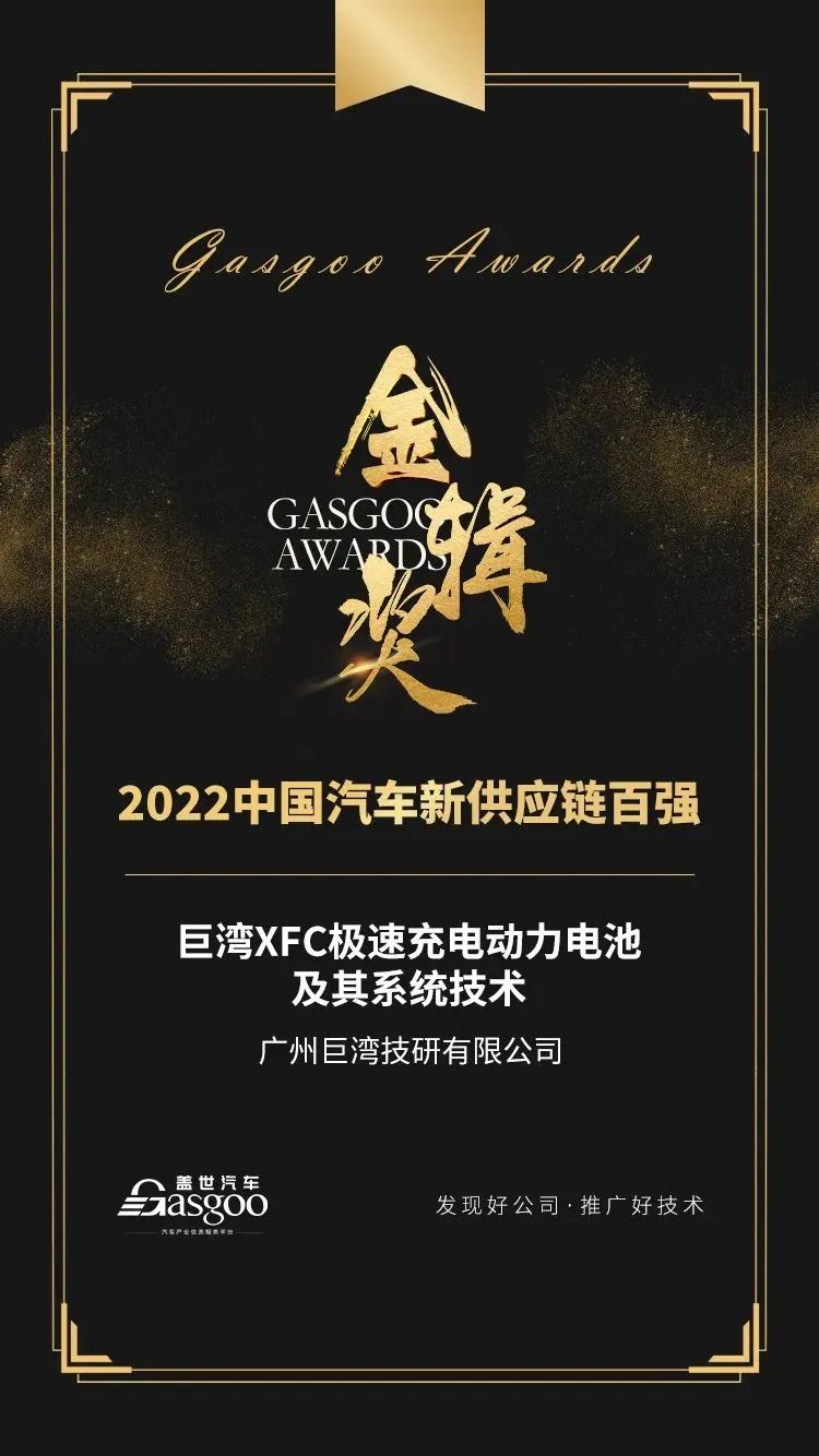10月26日,第四屆“金輯獎”中國汽車新供應(yīng)鏈百強頒獎典禮在上海盛大開幕。在來自電池行業(yè)內(nèi)眾多知名企業(yè)及供應(yīng)商的近千項創(chuàng)新產(chǎn)品中,南粵基金投資企業(yè)——廣州巨灣技研有限公司(簡稱“巨灣技研”) “XFC極速充電技術(shù)”憑借行業(yè)領(lǐng)先的技術(shù)實力及應(yīng)用前景脫穎而出,斬獲動力總成電氣化領(lǐng)域“中國汽車新供應(yīng)鏈百強”稱號。