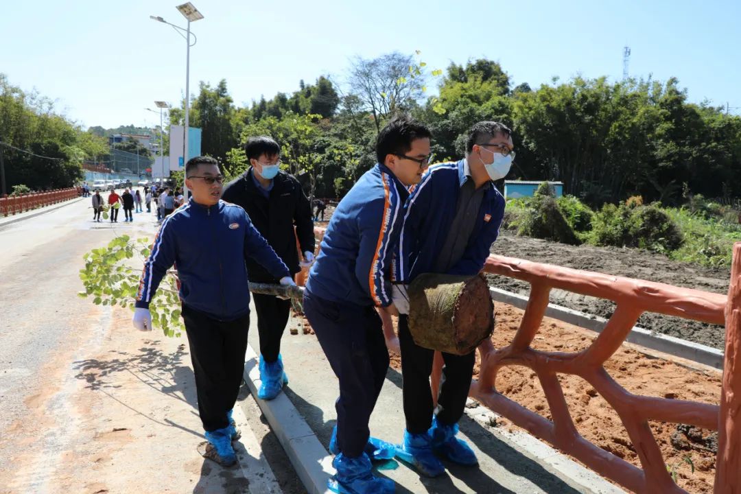活動現(xiàn)場,大家熱情高漲,揮鍬鏟土、扶苗填坑、提水澆灌,分工協(xié)作、干勁十足,有條不紊完成每道工序。經(jīng)過共同努力,50余株紫花風(fēng)鈴木、紫荊和風(fēng)鈴等青苗挺拔樹立,為原本空曠的道路增添了一抹抹生機(jī)和綠意。