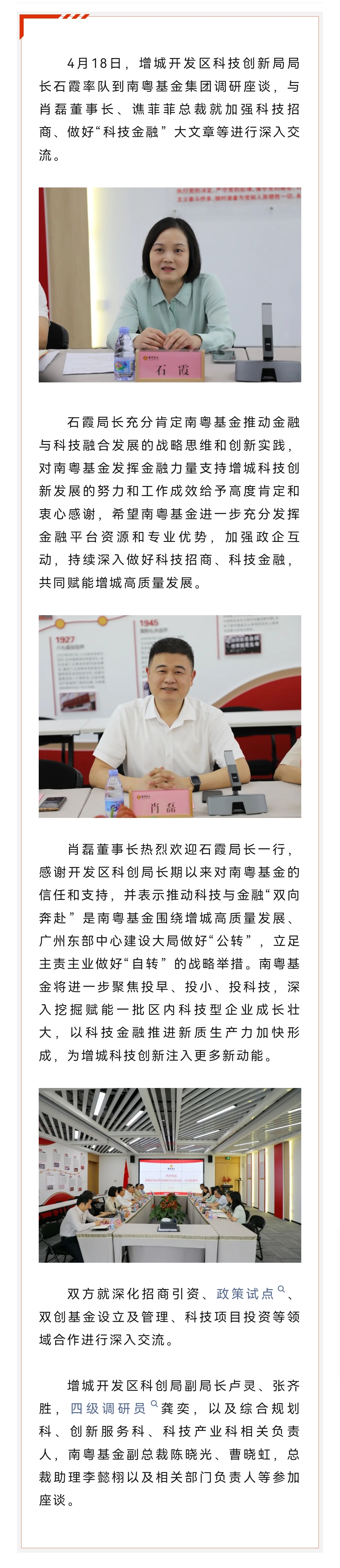 增城開發(fā)區(qū)科技創(chuàng)新局局長石霞到南粵基金集團調(diào)研座談