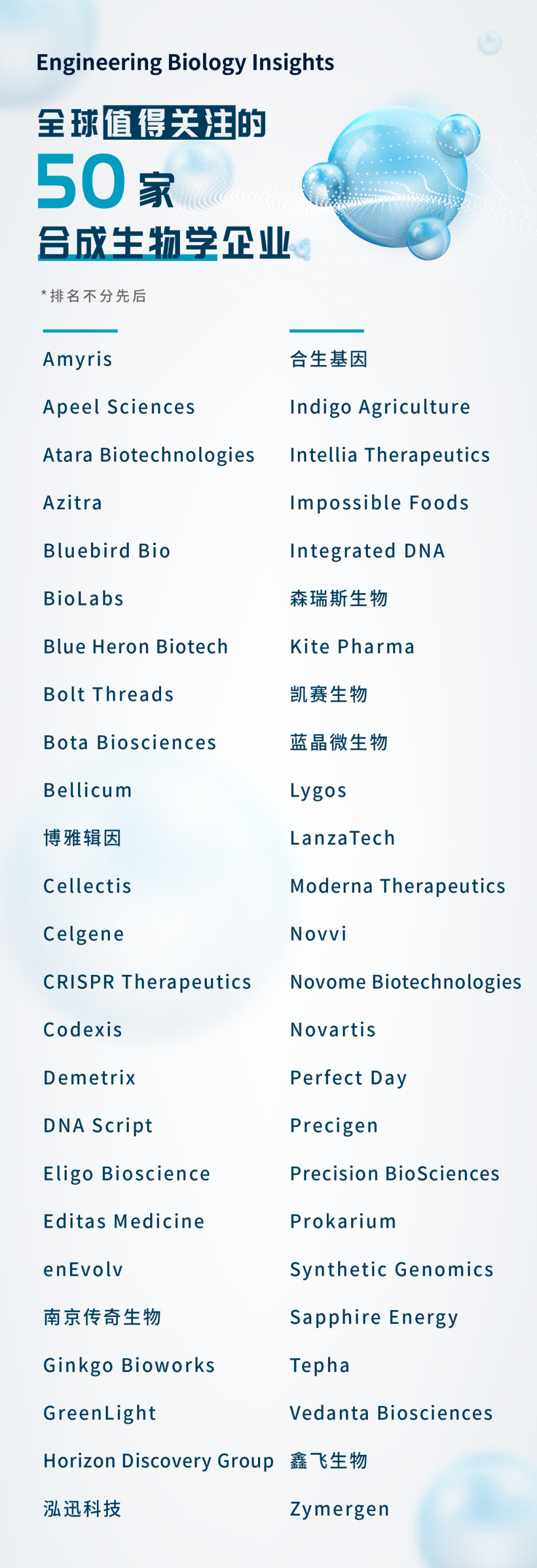從 CB Insights 的統(tǒng)計數(shù)中不難發(fā)現(xiàn),從 2015 年開始,大批合成生物學相關(guān)公司相繼成立。融資階段分布數(shù)據(jù)顯示,2015-2017 年,融資階段主要分為在種子 / 天使輪,3 年平均占比超 35%;而 2018 年至今,融資階段向 A 輪及 B 輪轉(zhuǎn)移,其中 2020 年 1-8 月,B 輪融資占比已達 33%。隨后,基于 EB Insights 的研究成果,劉炯在會上發(fā)布了 “全球最值得關(guān)注的 50 家合成生物學企業(yè)” 榜單,并重點介紹深耕中國本土市場的公司,在他們用 “上帝之手” 譜寫生命奧秘的背后,變革的巨浪早已奔涌而至。立足中國,為了實現(xiàn)可持續(xù)性發(fā)展,合成生物學可以獲得能源、化學等方面的可持續(xù)產(chǎn)品,也能減少環(huán)境污染。而且更重要的是,合成生物學是一門新興學科,雖然目前中國的生物技術(shù)整體而言還趕不上發(fā)達國家,但是對于早期階段起步的合成生物學,中國也許能成為這一具有極大潛力的研究領(lǐng)域的主要參與者。關(guān)鍵詞:全球頂尖合成生物學產(chǎn)業(yè)團隊,構(gòu)建計算驅(qū)動的生物鑄造廠上榜理由:Bota Biosciences 成立于美國劍橋,以計算為基礎(chǔ)搭建酶工程、菌株工程和發(fā)酵工藝工程平臺,涵蓋酶催化、生物轉(zhuǎn)化和生物全合成三大技術(shù)路徑,通過由云端遠程操控和自動化設(shè)施組成的云端實驗室,可實現(xiàn)每年 1,000,000+ 通量的菌株構(gòu)建實驗操作、測試和數(shù)據(jù)收集,為化?、?品、農(nóng)業(yè)和制藥等行業(yè)提供創(chuàng)新產(chǎn)品研發(fā)與大規(guī)模生產(chǎn)解決方案。團隊成員在合成生物學領(lǐng)域具有多個產(chǎn)品的成功工業(yè)化經(jīng)驗。 關(guān)鍵詞:國內(nèi)首個 CRISPR 基因編輯療法臨床試驗申請?zhí)峤?/strong>上榜理由:基于獲獎技術(shù) CRISPR 為多種遺傳疾病和癌癥加速藥物研究以及開發(fā)創(chuàng)新療法 。今年,該公司宣布中國國家藥品監(jiān)督管理局藥品審評中心(CDE)已經(jīng)受理其針對輸血依賴型 β 地中海貧血的基因編輯療法產(chǎn)品 ET-01 的臨床試驗申請,這是國內(nèi)首個 CRISPR 基因編輯療法臨床試驗申請?zhí)峤?。ET-01 的通用名為 “CRISPR/Cas9 基因修飾 BCL11A 紅系增強子的自體 CD34+ 造血干祖細胞注射液”,通過對造血干細胞的合成改造,解決輸血依賴型 β 地中海貧血患者的患病痛苦。關(guān)鍵詞:全球首次利用合成生物學技術(shù)優(yōu)化、改造的免疫療法用于治療中晚期腫瘤病人上榜理由:中國首家致力于合成生物技術(shù)在生物醫(yī)藥領(lǐng)域應用的高新技術(shù)公司,2020 年 11 月 27 日,基于國內(nèi)原創(chuàng)的合成生物技術(shù)開發(fā)的首款基因治療產(chǎn)品 SynOV1.1 獲得美國 FDA 臨床試驗許可,用于治療包括中晚期肝癌在內(nèi)的甲胎蛋白(AFP)陽性實體瘤,并計劃近期在美國紀念斯隆?凱特琳癌癥中心(Memorial Sloan Kettering Cancer Center)開展 I/IIa 期臨床研究。這款藥物在中國的臨床試驗申請亦正在進行中。將全球第一次將經(jīng)過合成生物學技術(shù)優(yōu)化、改造的免疫療法用于治療中晚期腫瘤病人。關(guān)鍵詞:讓 DNA 技術(shù)和應用更好地服務生活上榜理由:團隊累計具有近 50 年的合成生物學行業(yè)經(jīng)驗。目前公司開發(fā)的技術(shù)平臺為全球領(lǐng)先的合成生物學完整的 DNA 合成組合平臺 ——Syno®1.0,Syno®2.0 和 Syno®3.0,可以高效應用于人源化抗體庫構(gòu)建、基因工程疫苗開發(fā)、工業(yè)酶優(yōu)化、染色體 / 基因組的合成、分子輔助育種以及 DNA 信息存儲的技術(shù)開發(fā)。目前,泓迅科技以 Syno® 合成技術(shù)平臺為基礎(chǔ)進一步設(shè)計和開發(fā)出先進的生物技術(shù)轉(zhuǎn)化及應用平臺 —— 泓迅 “GPS” 平臺,該平臺依據(jù)生物學最核心的中心法則,在基因型 (Genotype)、表型(Phenotype)基礎(chǔ)上引入了人工合成型(Synotype),利用 “設(shè)計”、“創(chuàng)建”、 “應用” 結(jié)合的方式解讀基因。上榜理由:被稱為 “合成生物學第一股” 的凱賽生物主打 “生物法長鏈二元酸” 系列產(chǎn)品,長鏈二元酸生產(chǎn)基地于 2003 年實現(xiàn)產(chǎn)業(yè)化,目前年產(chǎn)能為 40,000 噸,是該產(chǎn)品的全球最大供應商。此外,凱賽生物已經(jīng)與杜邦、艾曼斯、贏創(chuàng)、諾和諾德等國際知名企業(yè)建立起了客戶關(guān)系,其中杜邦(Dupont)近三年以來都是第一大客戶,高性能尼龍瑞士公司艾曼斯(EMS)是其第二大客戶。2019 年,境外營收占比為 54.44%,境內(nèi)營收的比例則為 45.56%。關(guān)鍵詞:PHA 生產(chǎn)菌株可以實現(xiàn)月噸級規(guī)模化量產(chǎn)上榜理由:藍晶微生物公司專注于合成生物技術(shù)研發(fā)和創(chuàng)新應用,主要針對生物功能分子和新型功能材料為客戶提供定制化研發(fā)方案,包括完全可降解生物材料 PHA、植物天然藥用分子和新型體外診斷試劑。生物塑料 PHA 已經(jīng)具備使用需求,2018 年下旬,自主研發(fā)的 PHA 生產(chǎn)菌株可以實現(xiàn)月噸級規(guī)?;慨a(chǎn),大麻二酚(CBD)是該公司下一個主推的產(chǎn)品。此外,藍晶微生物正在構(gòu)建一個依靠自動化技術(shù)研發(fā)細胞工廠的流水線,并逐步使用人工智能來取代傳統(tǒng)人工解讀實驗數(shù)據(jù)、生成假設(shè)、規(guī)劃實驗這類工作,公司自主開發(fā)的 Holog 系