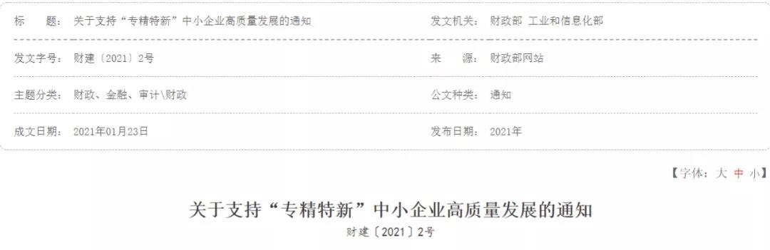 2021年1月23日,財(cái)政部、工業(yè)和信息化部聯(lián)合印發(fā)《關(guān)于支持“專(zhuān)精特新”中小企業(yè)高質(zhì)量發(fā)展的通知》,啟動(dòng)中央財(cái)政支持“專(zhuān)精特新”中小企業(yè)高質(zhì)量發(fā)展政策。為讓企業(yè)對(duì)申報(bào)相關(guān)事宜有更深入的了解,現(xiàn)對(duì)各地申報(bào)認(rèn)定“專(zhuān)精特新”政策進(jìn)行匯總。