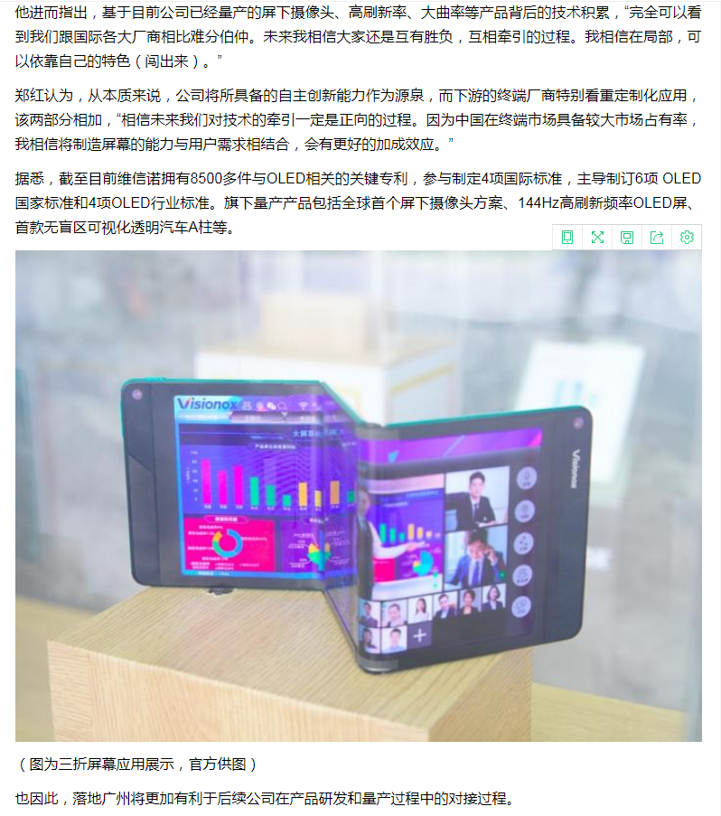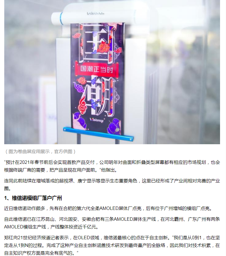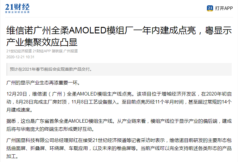 21財經|維信諾廣州全柔AMOLED模組廠一年內建成點亮,粵顯示產業(yè)集聚效應凸顯
