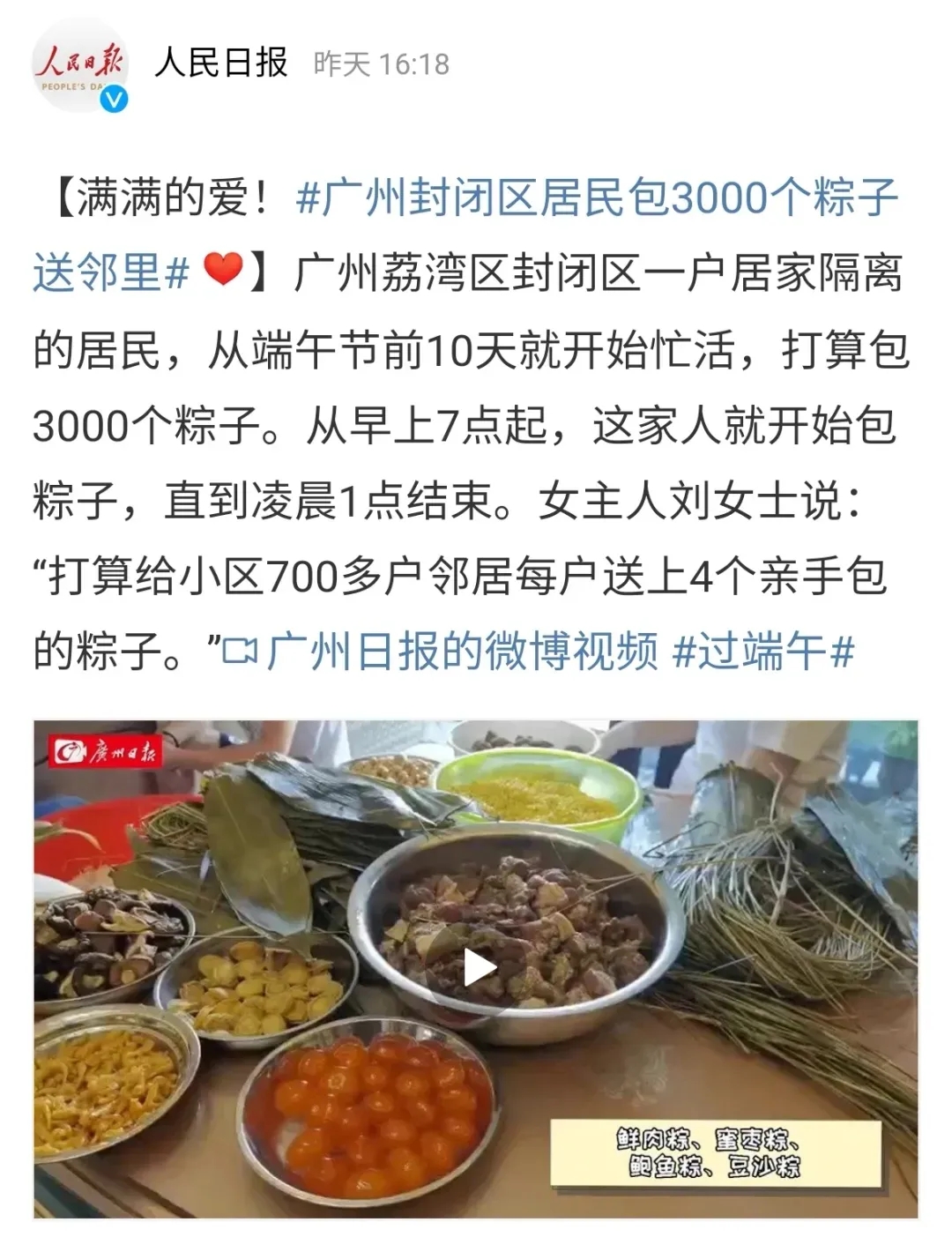 “滿滿的愛!廣州封閉區(qū)居民包3000個(gè)粽子送鄰里……”6月12日,《人民日?qǐng)?bào)》官微轉(zhuǎn)發(fā)了一個(gè)疫情之下演繹大城小愛的感人故事,引來眾多網(wǎng)友點(diǎn)贊。故事主角“劉女士”,便是南粵基金“南粵菁英匯”項(xiàng)目總經(jīng)理劉燕。