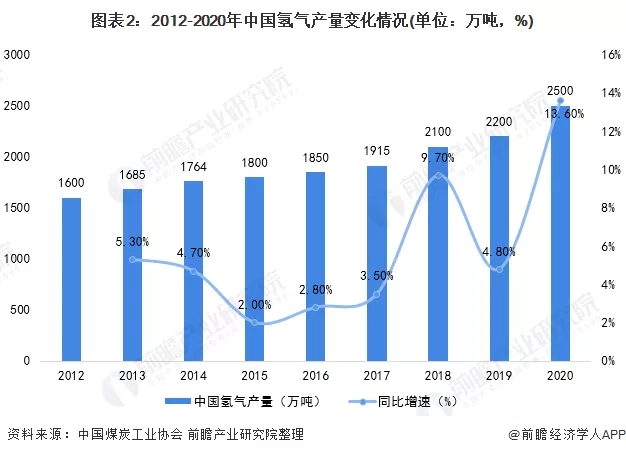 經(jīng)過十余年的長足發(fā)展,我國氫氣年產(chǎn)量已逾千萬噸規(guī)模,位居世界第一大產(chǎn)氫國。據(jù)中國煤炭工業(yè)協(xié)會數(shù)據(jù)統(tǒng)計(jì),2012-2020年,中國氫氣產(chǎn)量整體呈穩(wěn)步增長趨勢。其中2019年-2020年,同比增速最為顯著,達(dá)到13.6%,且2020年,中國氫氣產(chǎn)量超過2500萬噸。